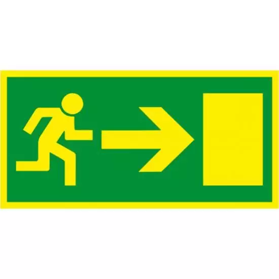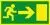 En dekal i mjukplast med den korrekta utformningen för nödutgång. Dekalen är konstruerad som ett klistermärke och kan därför enkelt klistras upp på lämplig plats. Märket har en grön bakgrund och en gulaktig, lyskraftig färg i symbolteckningen. Kan användas som skylt för nödutgång.